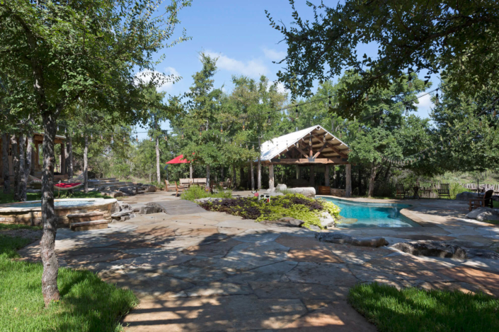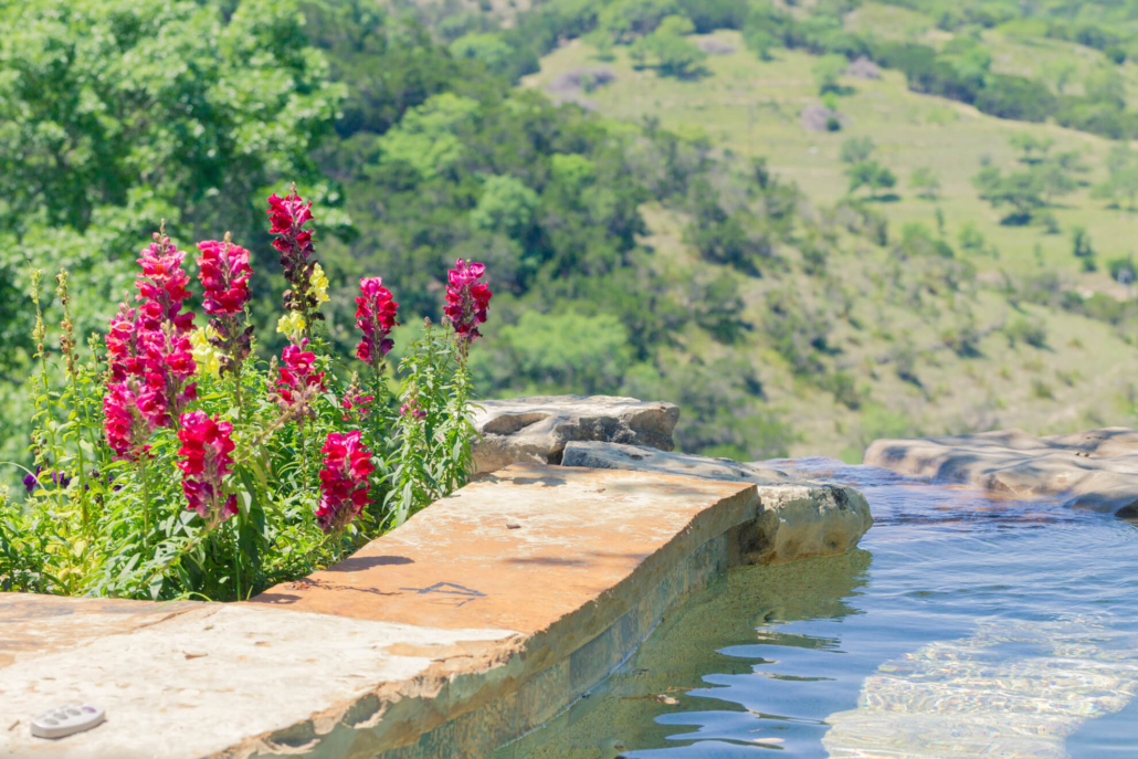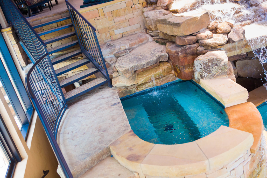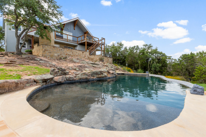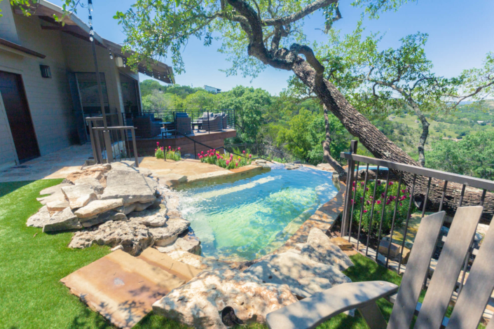 a Natural Boulder Pool custom-built and inspired by the Guadalupe River. This pool was designed to mimic a natural spring formation that is common along the river. It is the centerpiece for an amazing hilltop retreat in New Braunfels, TX.